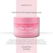 MEERACLE Pink Peptide Sleeping Mask adalah rawatan malam yang bekerja aktif ketika anda tidur untuk membantu menenangkan kulit, memberi efek plump, dan menyerlahkan glow semula jadi keesokan pagi. Diperkaya dengan Peptide & Vitamin B12, sleeping mask ini membantu menyokong pembaikan skin barrier, meningkatkan keanjalan kulit serta menjadikan kulit kelihatan lebih segar, lembap dan sihat selepas bangun tidur.